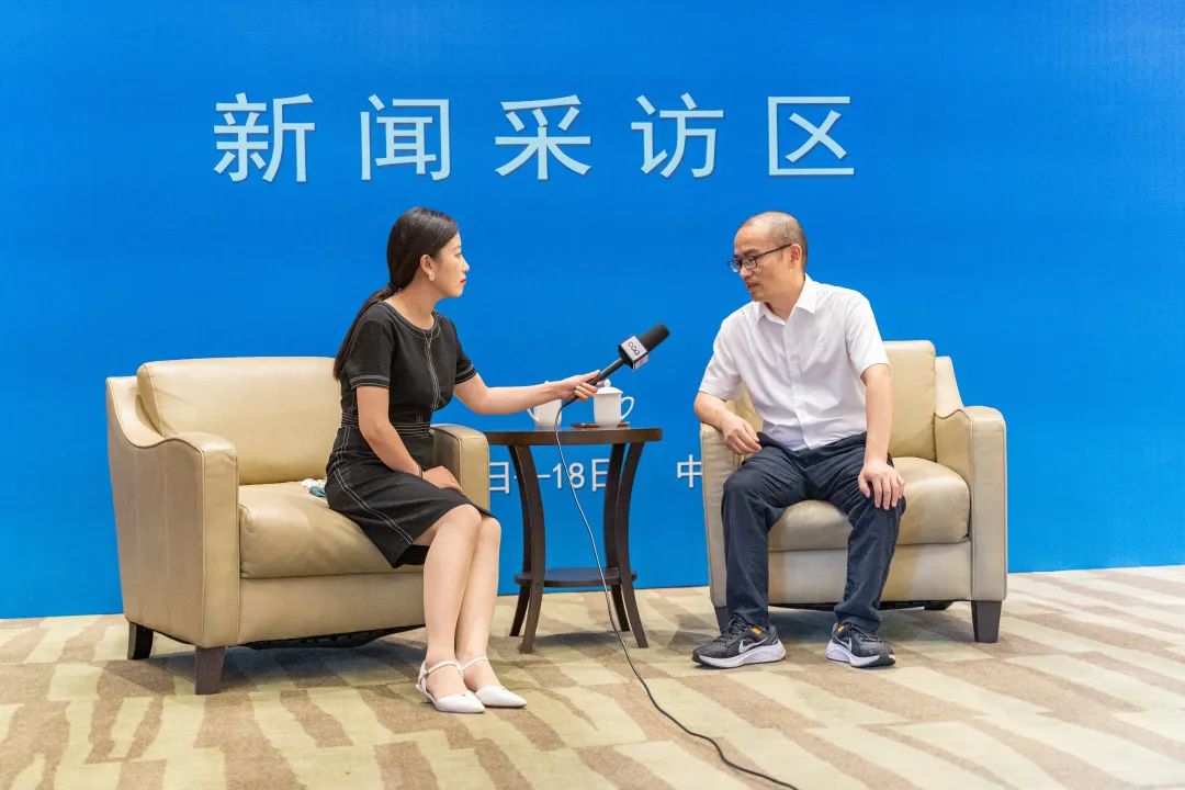 大会新闻采访区,大宏立总经理李泽全接受采访,介绍了大宏立造—环保智能砂石破碎工厂、绿色材料科技园的核心亮点,畅谈了公司未来发展规划。